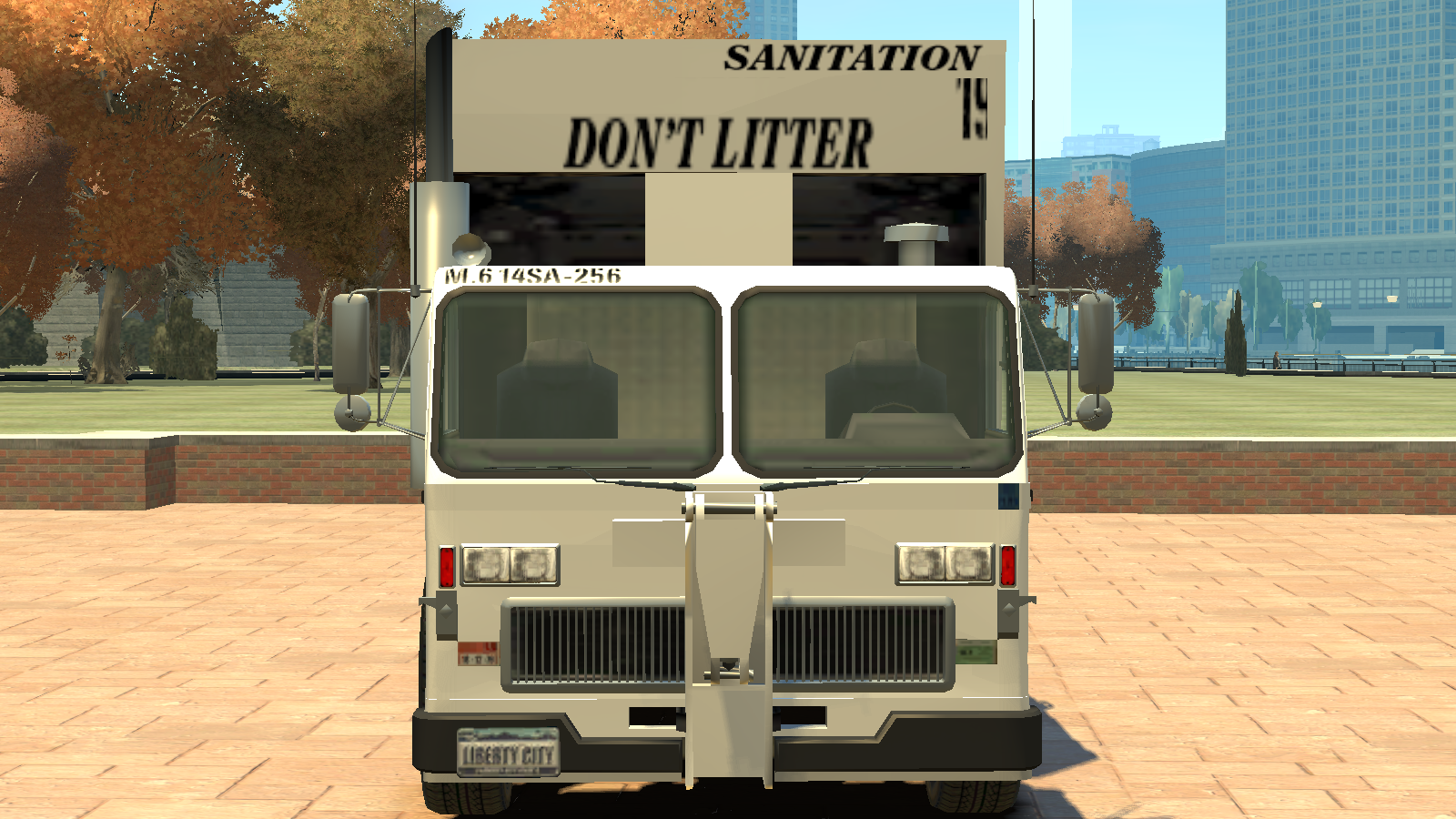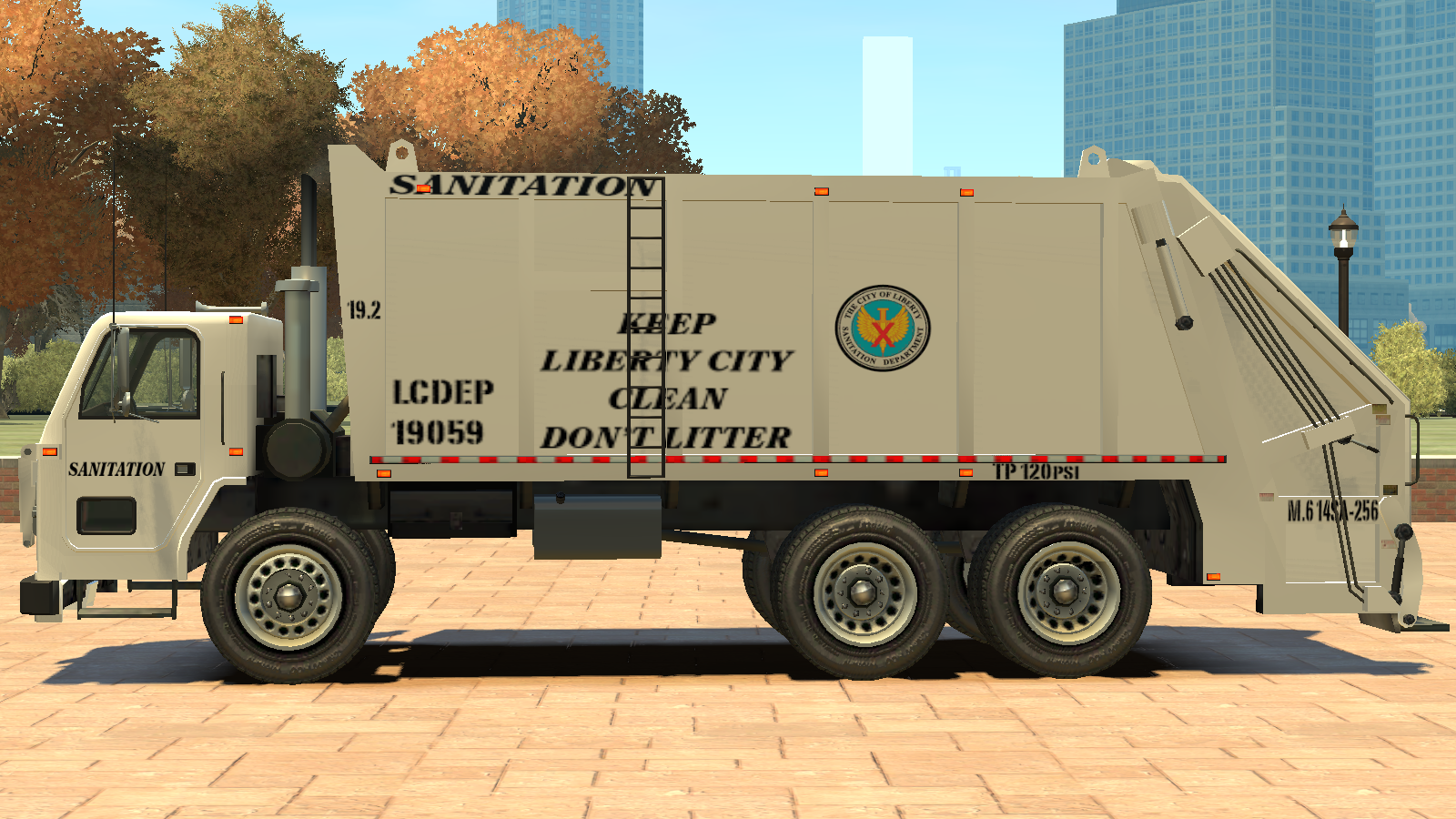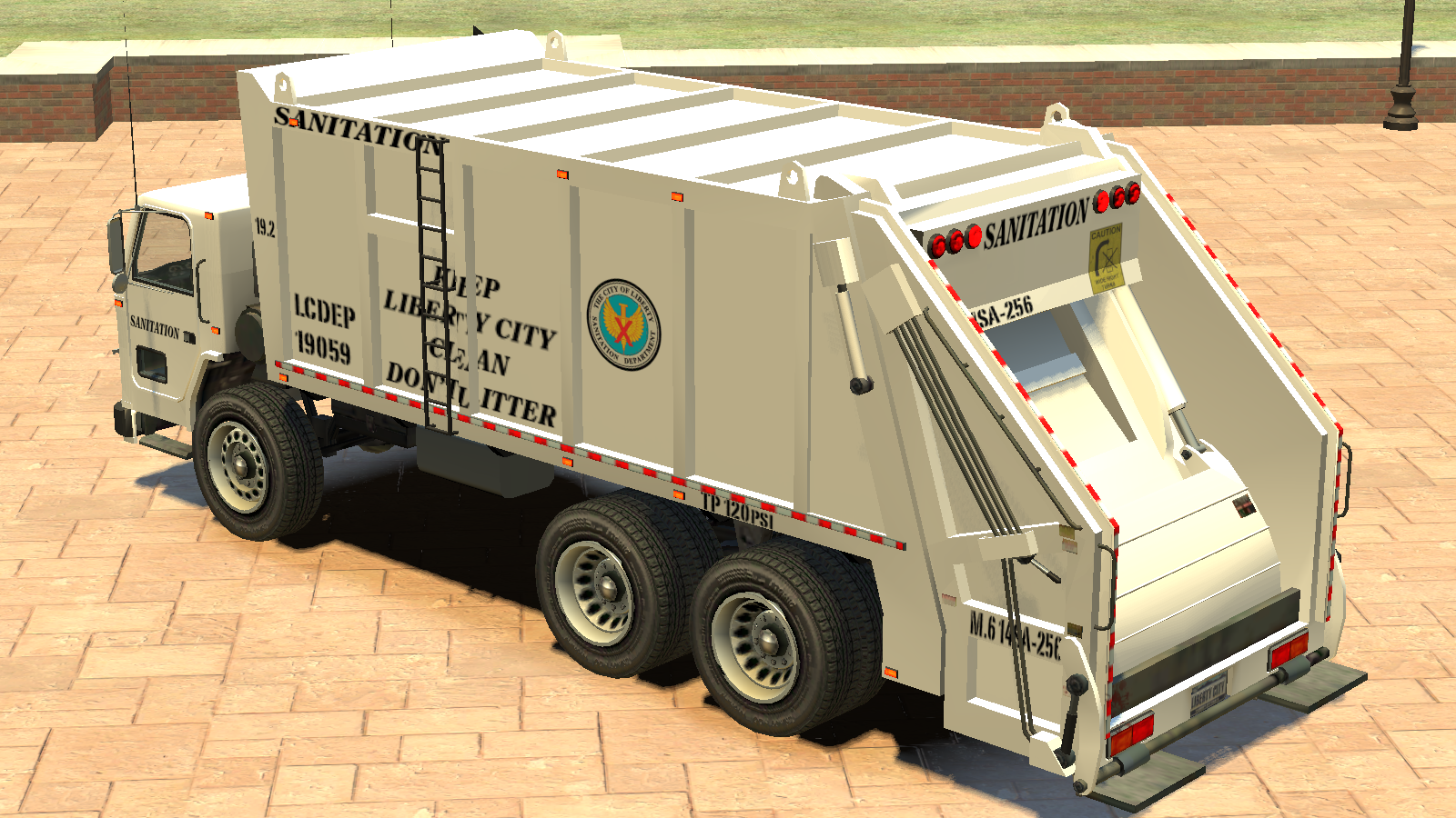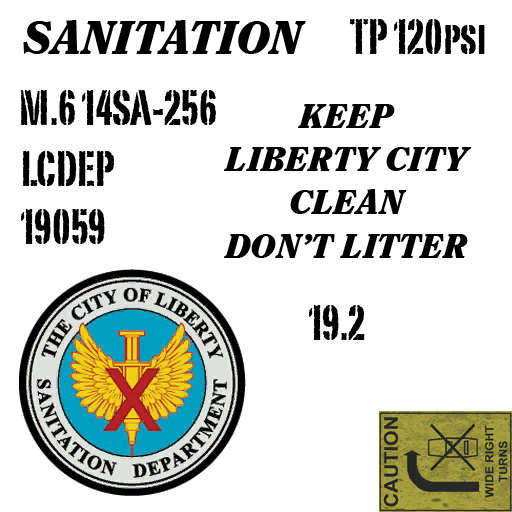The entire truck is only seen in a white base color with Liberty Sanitation Department decals across the vehicle, including the company logo on the sides, and numerous warning stickers on both ends. The truck also contains the abbreviation "LCDEP", inspired by NJDEP, which hints at the existence of an organisation called Liberty City Department of Environmental Protection. The vehicle uses a set of industrial wheels also seen on vehicles such as the Mule and the Flatbed.