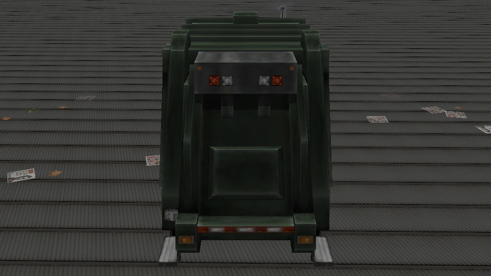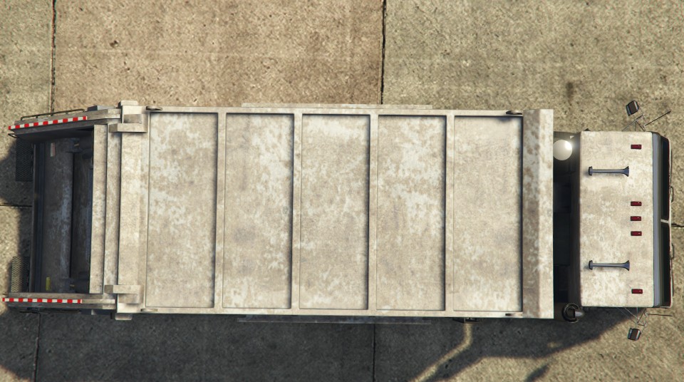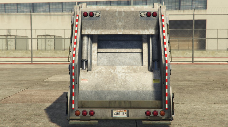 The rear section is mostly predominated by the trash compactor sitting atop the truck's chassis, which is twice as tall than the cabin (though the cabin itself is actually about the same size, just sitting in a lower height). Along the chassis, two chrome fuel tanks are mounted near the front end on either side, and a storage box on the driver side. Along the sides of the container there are red/white warning stripes and numerous marker lights, while an unusable ladder can be seen on the driver side. On the rear end, the vehicle has vertical warning stripes and numerous tail lights, with the upper ones being circular and the lower ones squared. At the bank of the truck, a functional (but not to the player) "trunk" serves as the compactor which opens and closes slightly. It does not appear open during normal gameplay, however.
