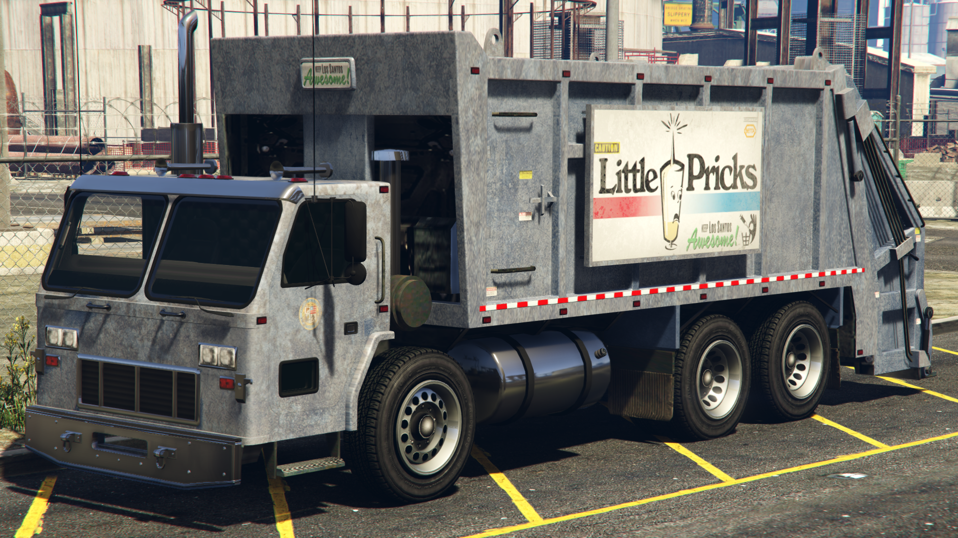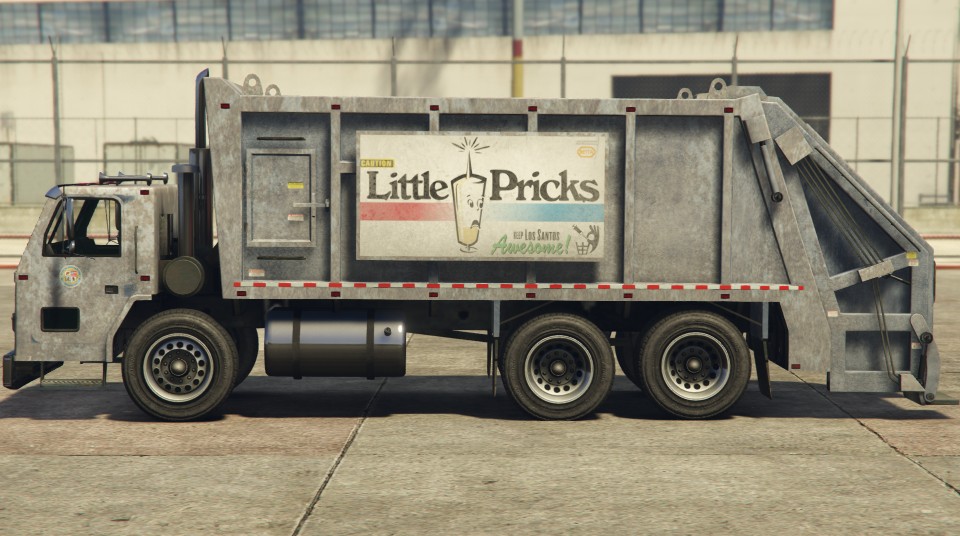 The rear section and compactor remain generally the same, but several changes were also made around it. Along the chassis, the smaller chrome fuel tanks have been switched out for a larger one on the driver side and a smaller box on the passenger side. Fender flaps have also been added in front and behind the rear two axles, which is also similar to trucks like the Biff and the Tipper. The front end of the compactor adds a small sign on top reading "Keep Los Santos Awesome", while the sides have large advertisements reading "Little Pricks" and "Butt Lovers". More marker lights have been added to the sides and the ladder found on the GTA IV model has been moved to the passenger side and toward the front, while an access hatch has also been added to the left front side of the compactor. On the rear end, the original lighting setup has been altered slightly; the inner taillights at the top are reversing lights, and the rectangular indicator and brake lights at the bottom are circular lights.