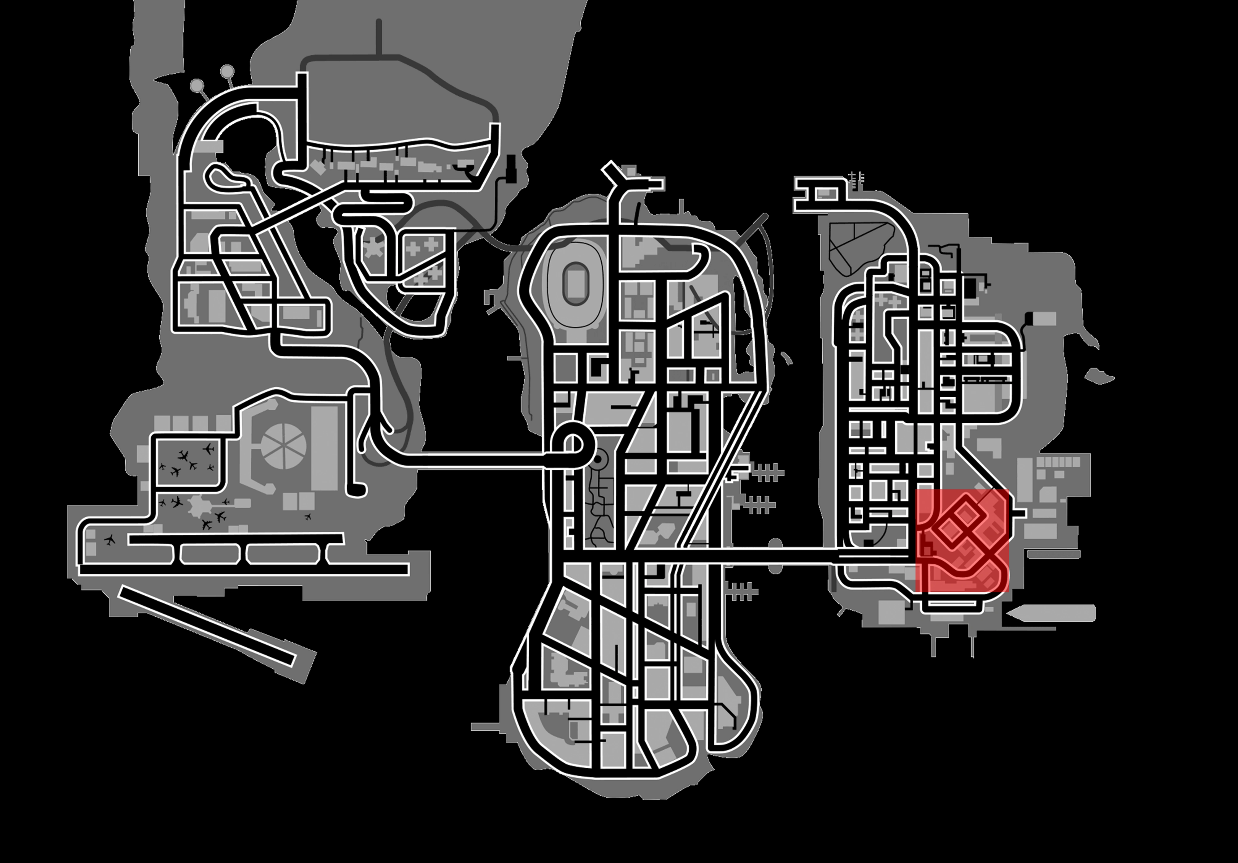 - AK47 – On top of Liberty Pharmaceuticals (behind the large sign) near an adrenaline icon, a health icon, and a body armor icon. The player needs to jump from the elevated tracks near the northeast side of the large complex to access.