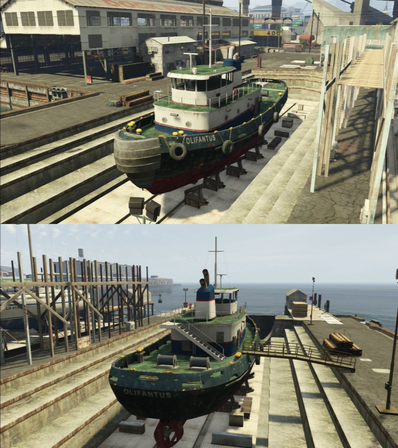 - Wrecks of the Tug can be seen partially submerged. They appear to retain the characteristic features from the Grand Theft Auto IV iteration.