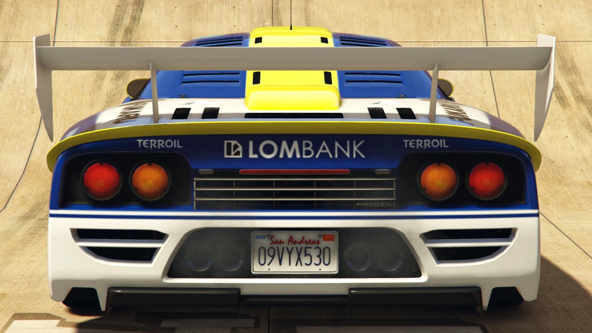 The rear end of the car has black panels holding the circular tail lamps, a central vent with "PROGEN" lettering on the lower passenger side and small upper strips for the third brake light and the reverse lights. The lower area is occupied by two rear vents with a single horizontal separation and a central meshed vent, with open sections for the twin-exit, twin exhaust tubes and the license plate in between the exhausts. The entire underside of the vehicle is carbon-plated, with an open section for the gearbox/diff and a diffuser on the rear end, with large horizontal panels mounted between the vertical blades.