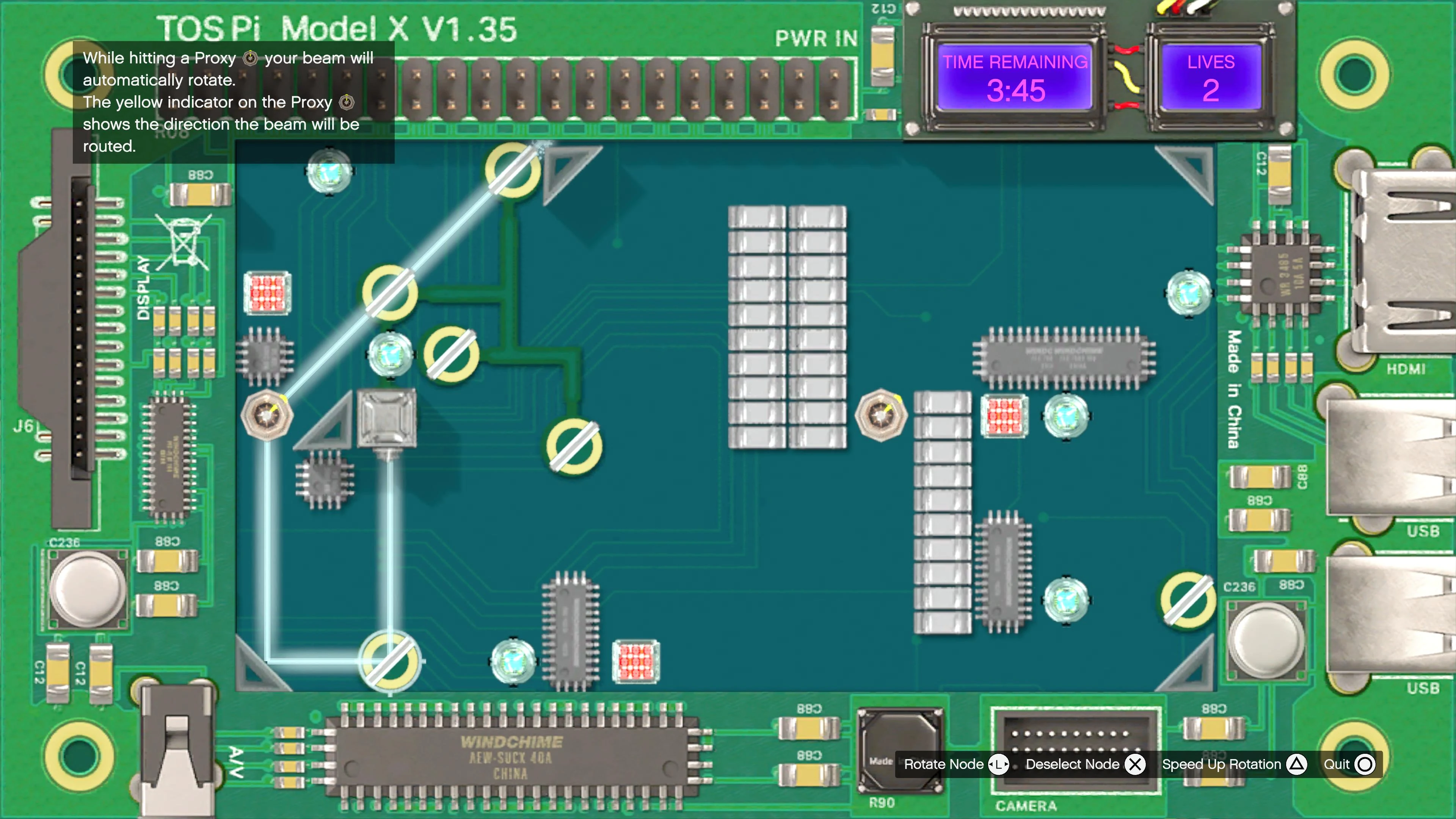 The player is then given six minutes and two lives to defuse the bomb, by triggering a minigame of conducting a beam with various mirror nodes to break various packets and avoid the firewalls (in a similar manner to the terminals in The Doomsday Scenario). They must complete two stages.