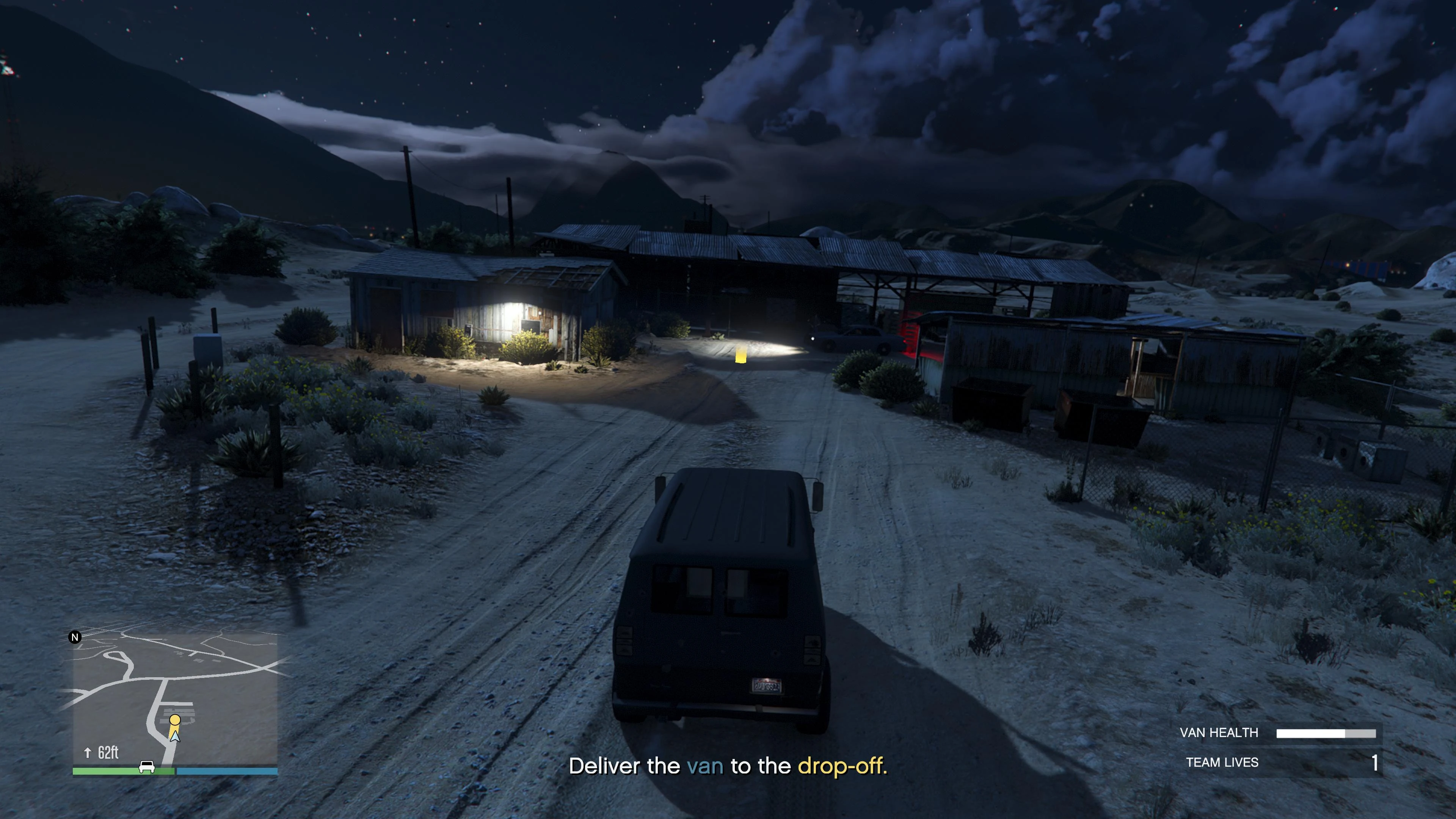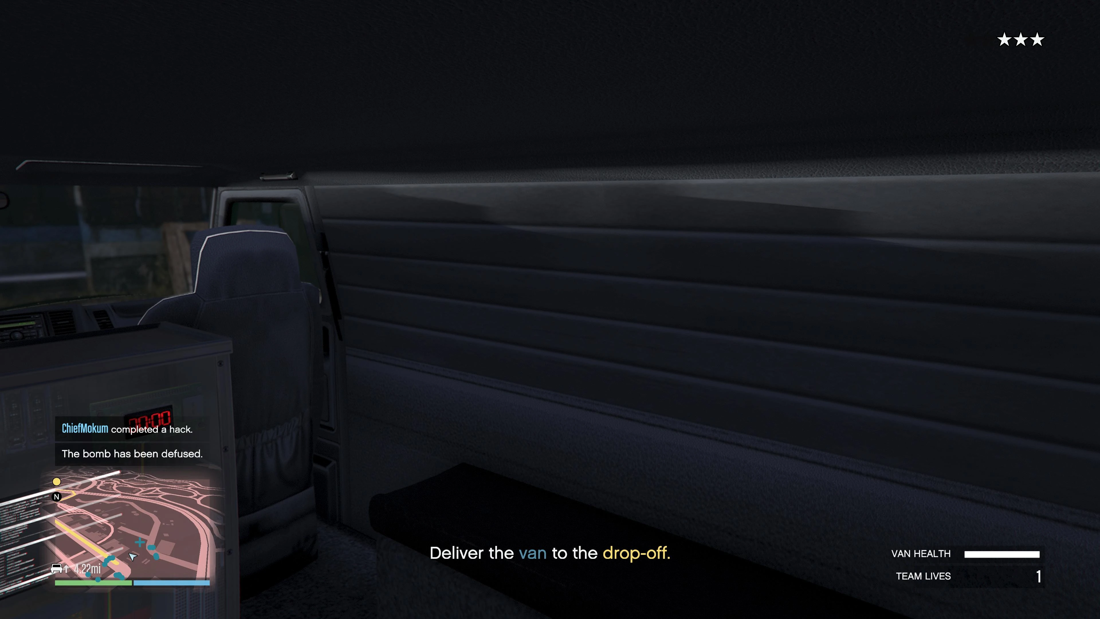 Once the player disarms the bomb, they have to evade the law enforcement and bring the van to a IAA safehouse outside Sandy Shores. A health bar is displayed on the lower right corner, which they must ensure it is not depleted, while the wanted level will be permanent within the city. After losing the cops and bringing the van to the drop-off, the mission is completed.