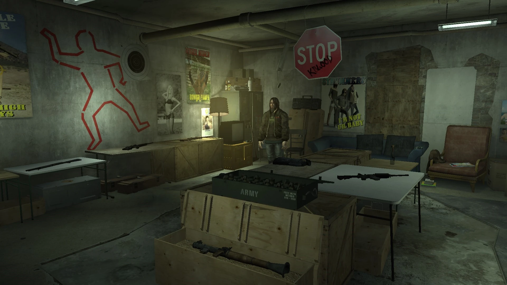 The W.O.M.D. poster seen in a couple of places in the shop. The weapons seen on the poster from top to bottom are: Smith & Wesson MK760, Sten MKII (with optic sight), M3 Grease Gun, MP40, Thompson submachine gun, MP5A1, CAR-15, Uzi (with wooden stock) and Madsen M/50.