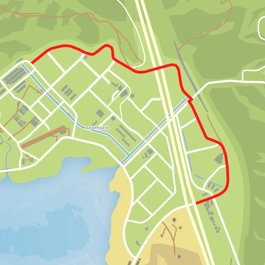 It begins at the Senora Freeway, then intersects with the Chianski Passage, Grapeseed Avenue, the Senora Freeway and O'Neil Way before ending at the intersection of Grapeseed Main Street and Joad Lane.