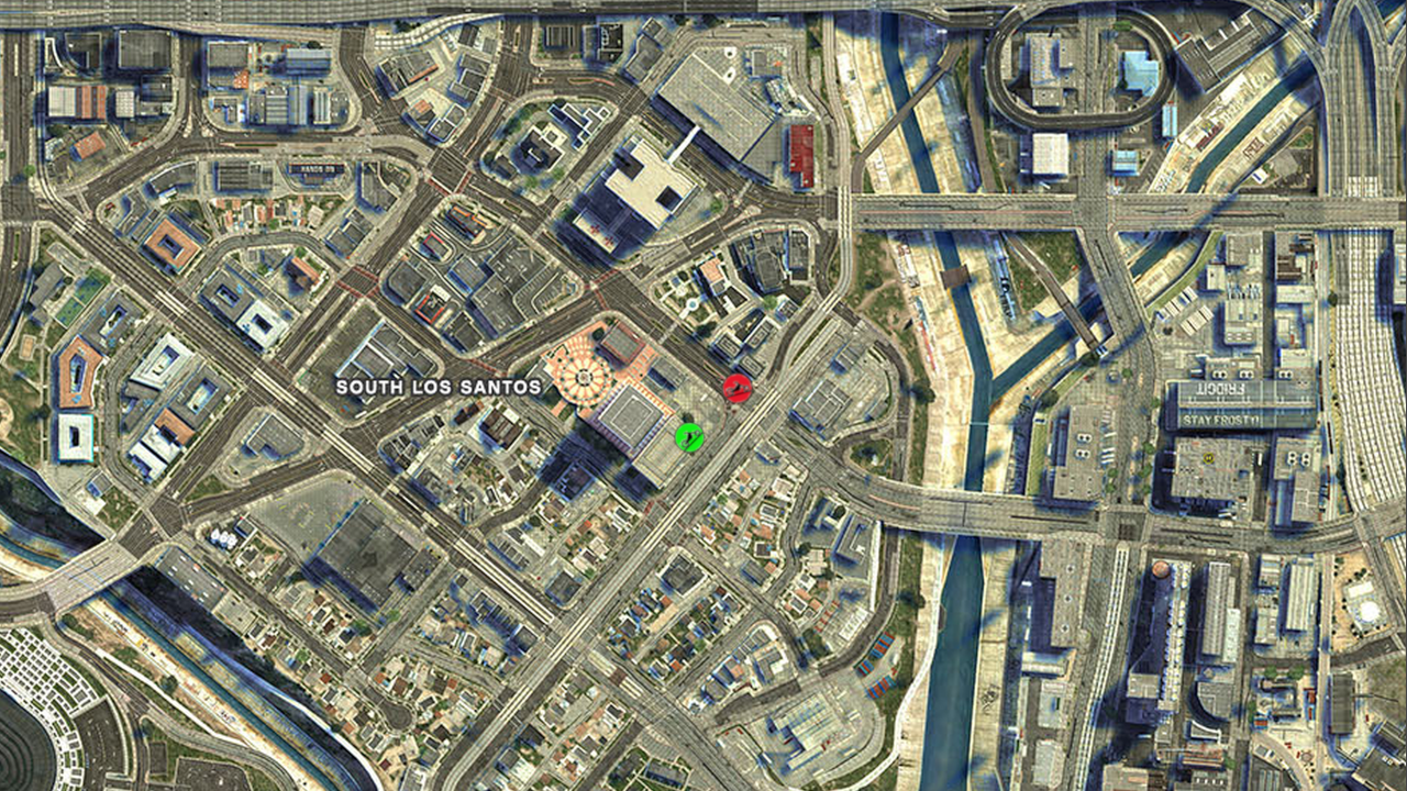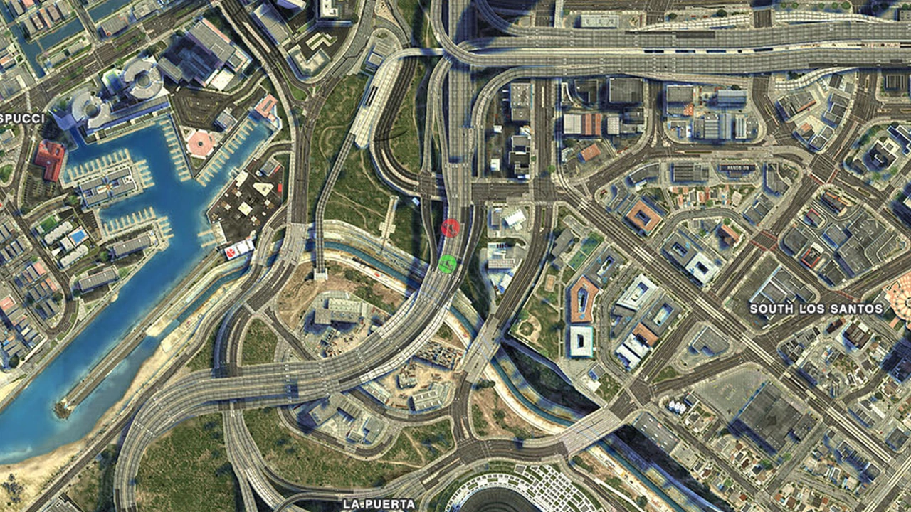 Junction of Los Santos Freeway and Del Perro Freeway, Del Perro Freeway onramp southbound from Hawick Avenue. Steel plate construction ramp over the LS River. | East Vinewood![]() |