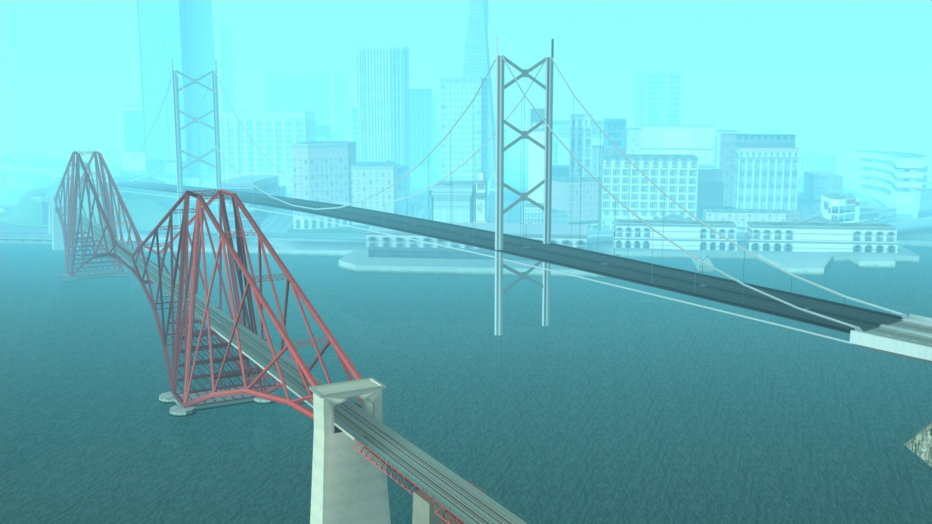 Scottish landmarks such as the Forth Bridge and Forth Road Bridge from Edinburgh (capital of Scotland) are also used as basis for in-universe American landmarks in the 3D Universe, appearing as the Kincaid Bridge and Garver Bridge in San Fierro respectively, both names referencing Scottish ancient family names.