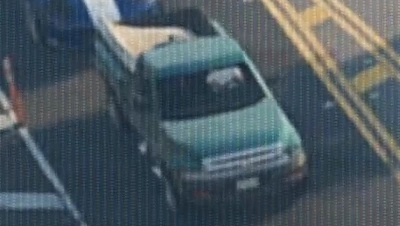 A three-quarter rear view shot of the pickup at Uncle Jack's Liquor (1:16).
