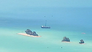 The boat can be seen travelling alongside a road bridge in the first trailer (0:35). It also appears in the distance in a postcard of the Leonida Keys, where several seagulls are seen flocking it.