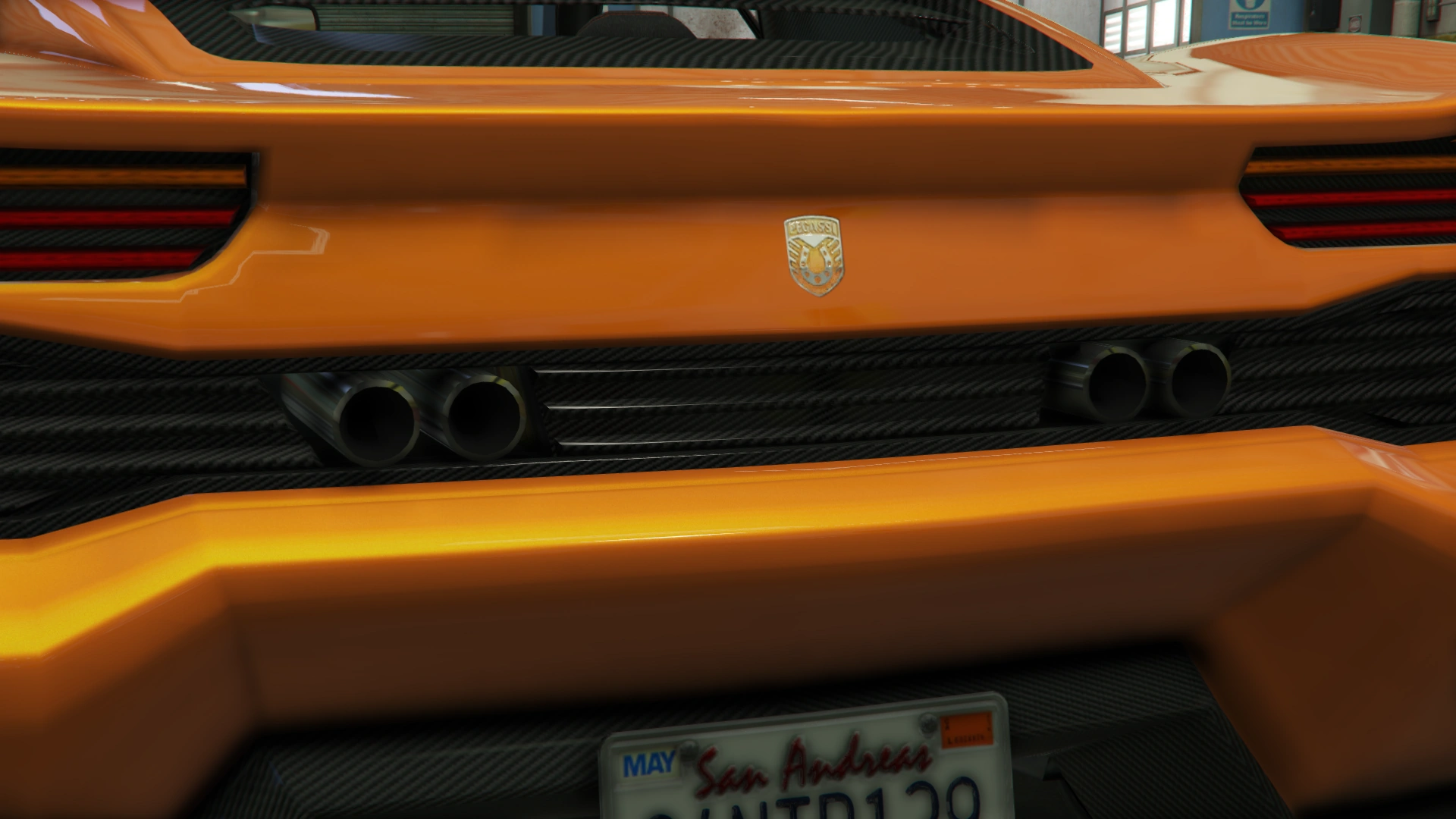 The Vacca is considered as the little brother of the Infernus, sharing a similar body shape and layout, but with a slightly shorter lenght and standard doors. The front of the car features three meshed intakes, with the central one being smaller than the outer ones and having the license plate just above it. The upper area has headlamp housings that are finished in carbon-fibre, each one containing large circular units with smaller ones almost above them, while the front boot bears a slightly impressed area around the outer edges and opens to reveal a spacious luggage compartment. The manufacturer logo can be seen on the front of the boot compartment.