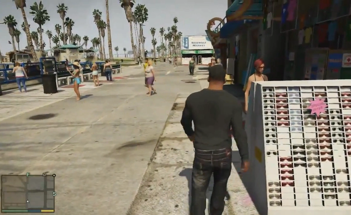 Franklin walking past a store on the Vespucci Beach Sidewalk.
