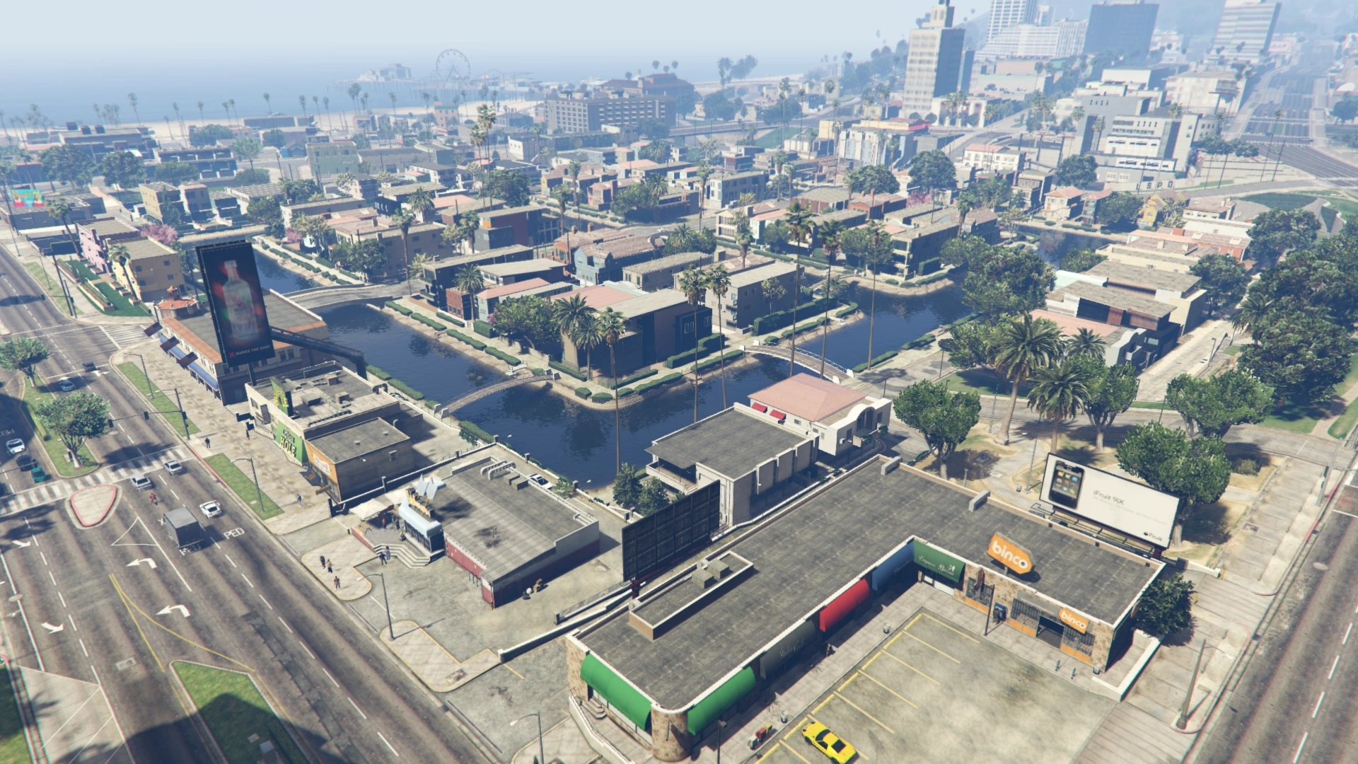 The Vespucci Canals are home to many wealthy people who want to live near the beach. The houses are not as upscale as those in places such as Rockford Hills, instead they're more focused on the stunning views the area has to offer. The canals themselves aren't very deep, so people are able to wade around freely. At both day and night time, the Vespucci Canals are relatively peaceful and quiet, aside from the occasional cars driving through.