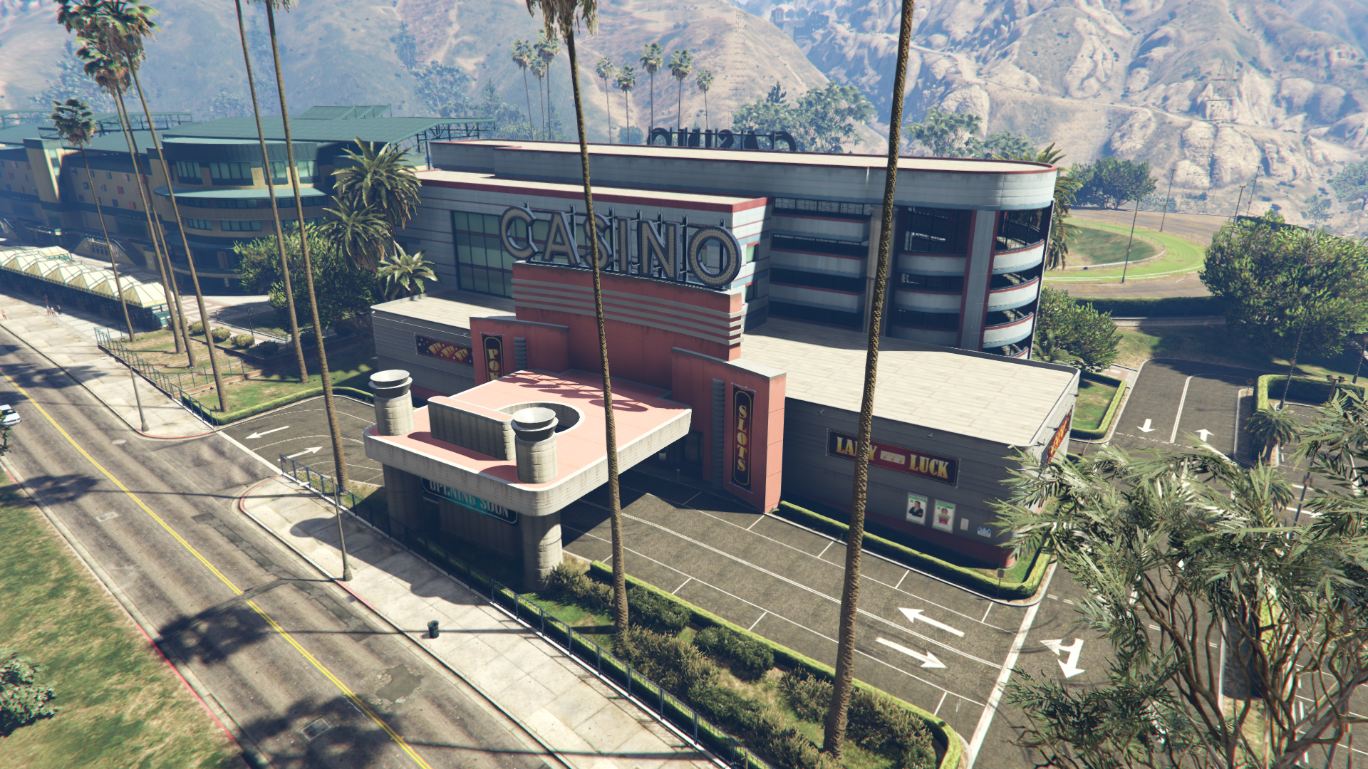 In 2013, the casino appears to have been under construction prior to the events of Grand Theft Auto V. An "Opening Soon" banner is present outside the main entrance.