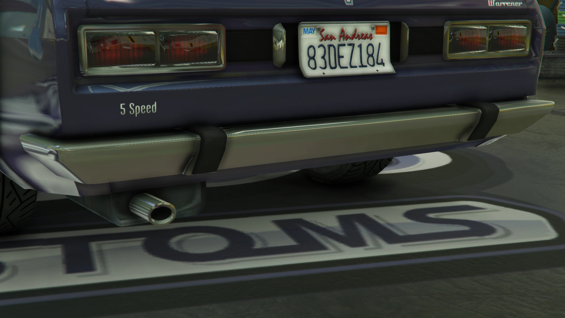 The rear end of the car has a rectangular section bearing a central license plate, two chrome sections beside it for the plate lights, black sections and dual red square lamps with chrome details surrounding them. The bumper is also finished in chrome and has two black vertical details on it, while the exhaust tube can be seen on the driver side, just below the bumper. The car bears the Vulcar logo on the centre and the "Warrener" lettering on the right-hand side of boot lid end, along with "5 Speed" lettering on the left-hand side, just above the bumper.