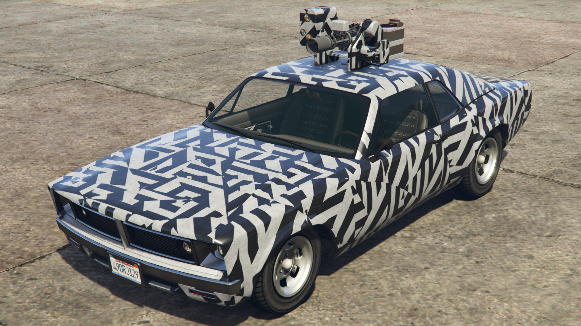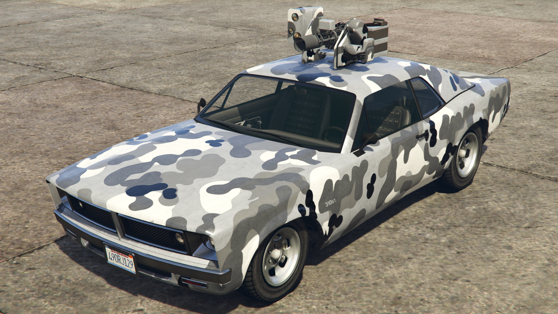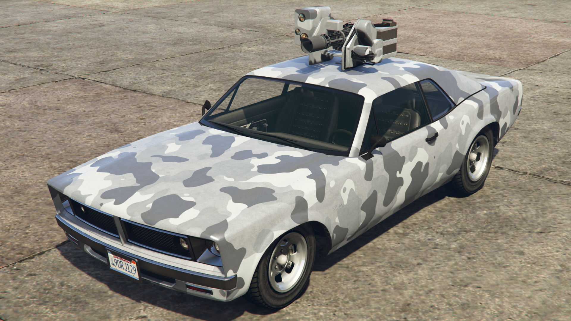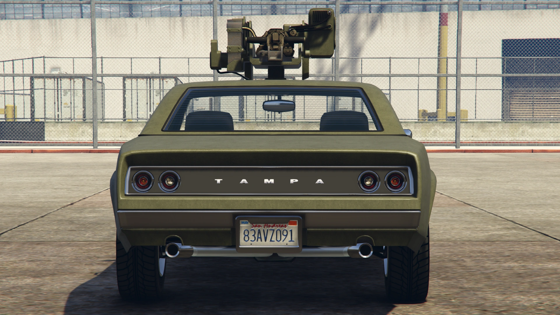 The car appears as an armed variant of the Tampa, featuring a roof-mounted Minigun as standard. The concept can be said to take inspiration from the Roadkill, a weaponized muscle car featured in the Twisted Metal series. Roadkill was a nod to the protagonist vehicle from the 1997 vehicular combat game Interstate 76, which featured a nearly identical weaponized muscle car complete with a roof-mounted machine gun for the player to use during the main quest.