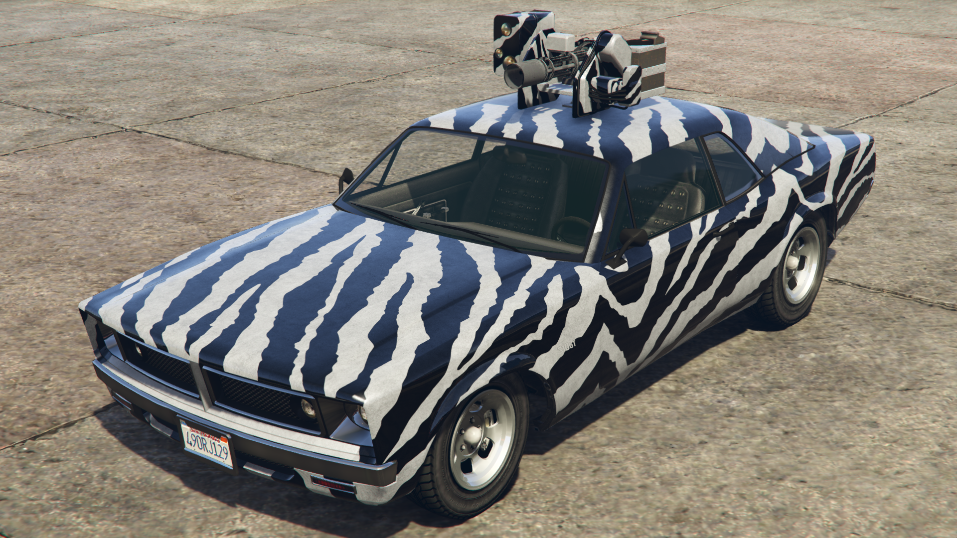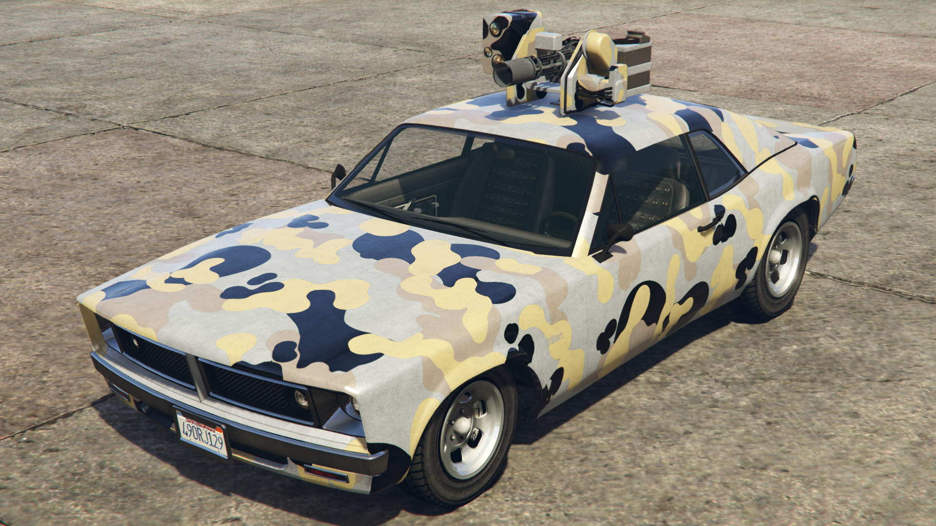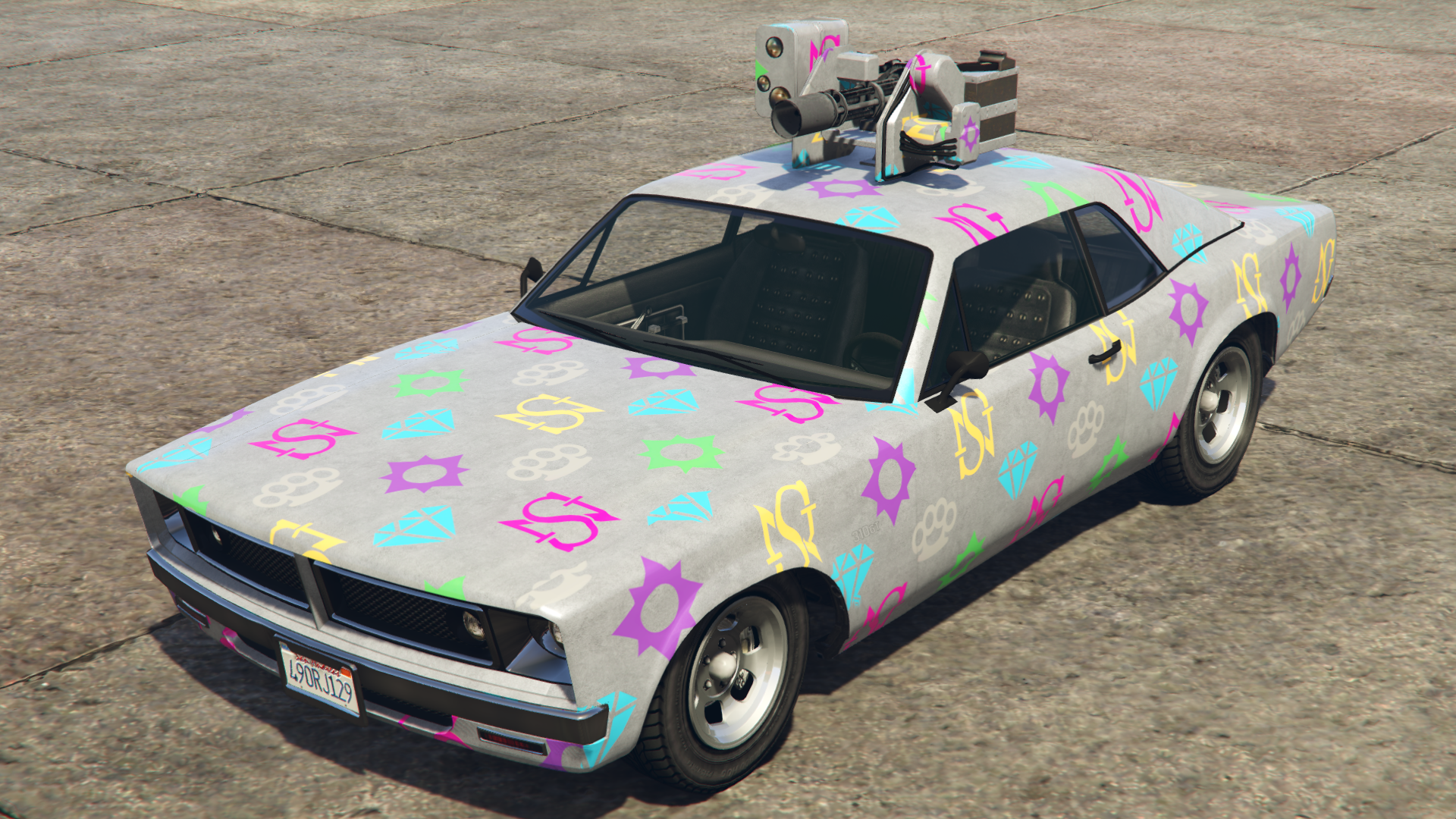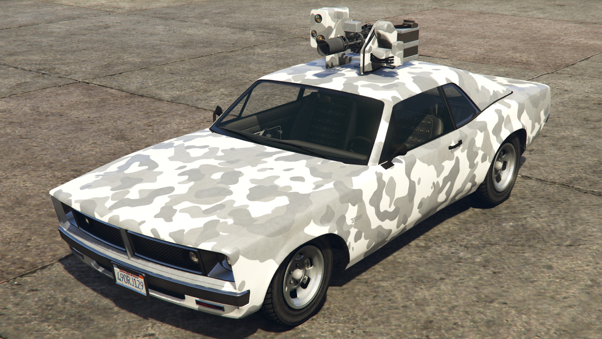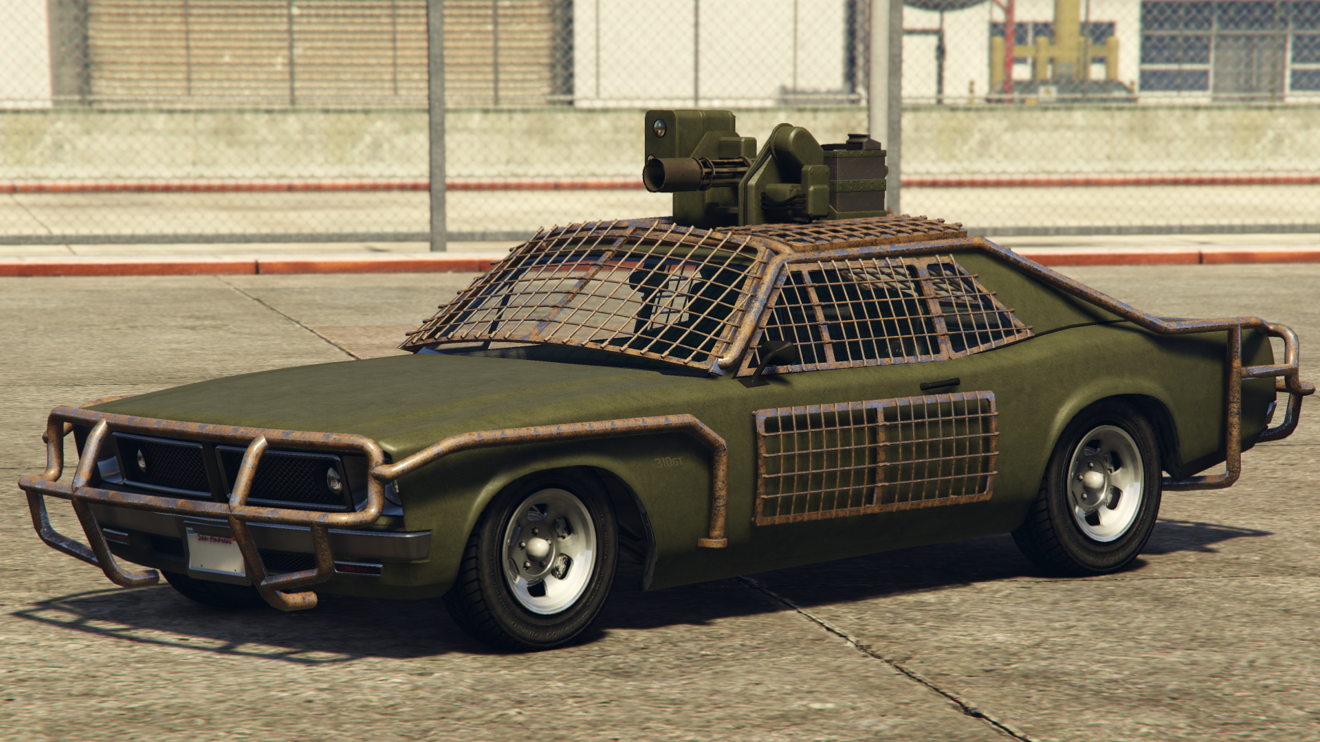 The car appears as an armed variant of the Tampa, featuring a roof-mounted Minigun as standard. The concept can be said to take inspiration from the Roadkill, a weaponized muscle car featured in the Twisted Metal series. Roadkill was a nod to the protagonist vehicle from the 1997 vehicular combat game Interstate 76, which featured a nearly identical weaponized muscle car complete with a roof-mounted machine gun for the player to use during the main quest.