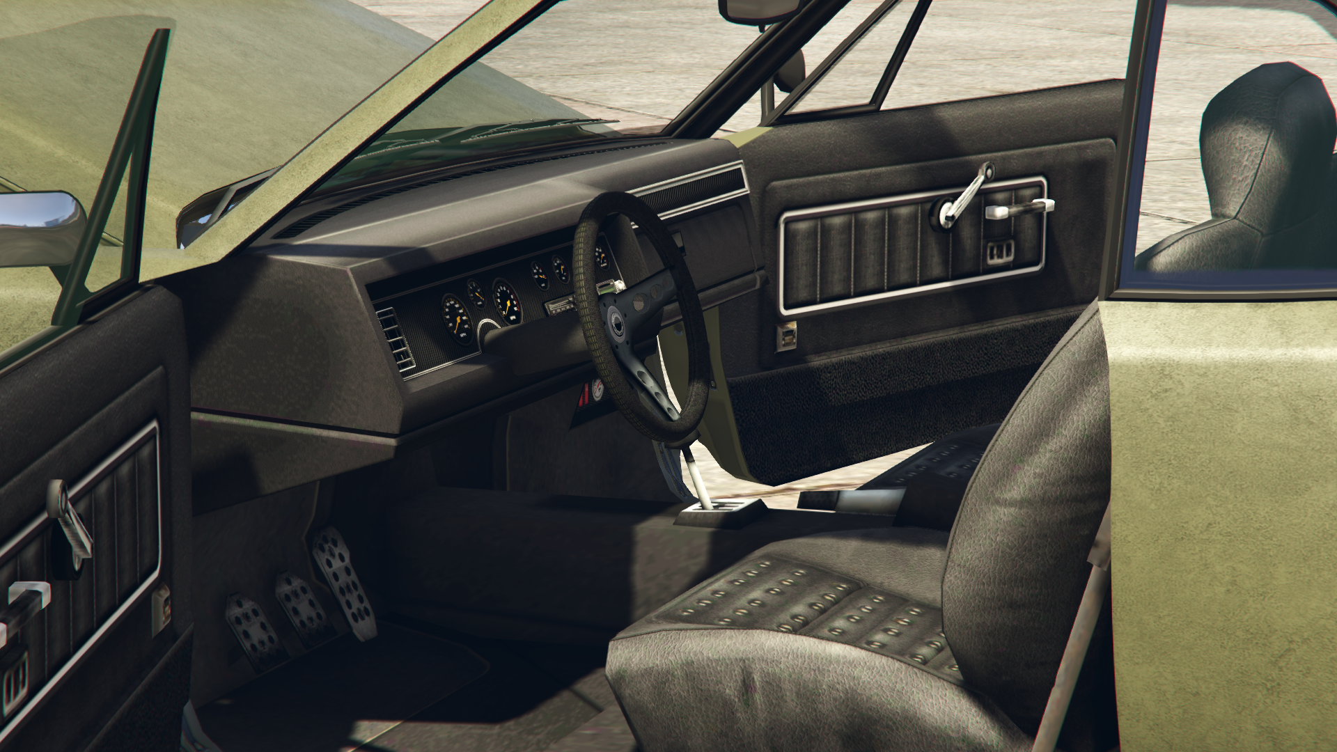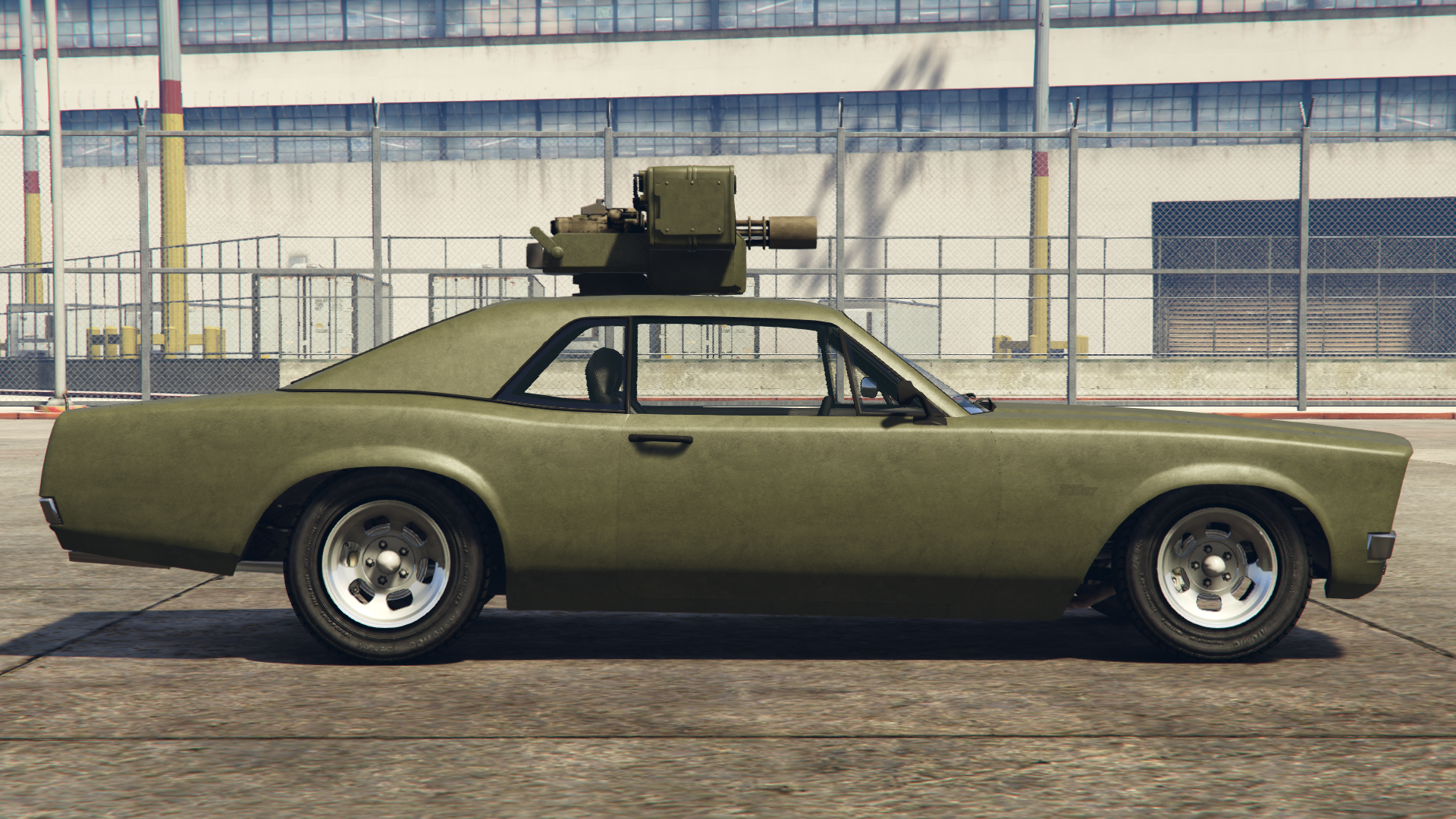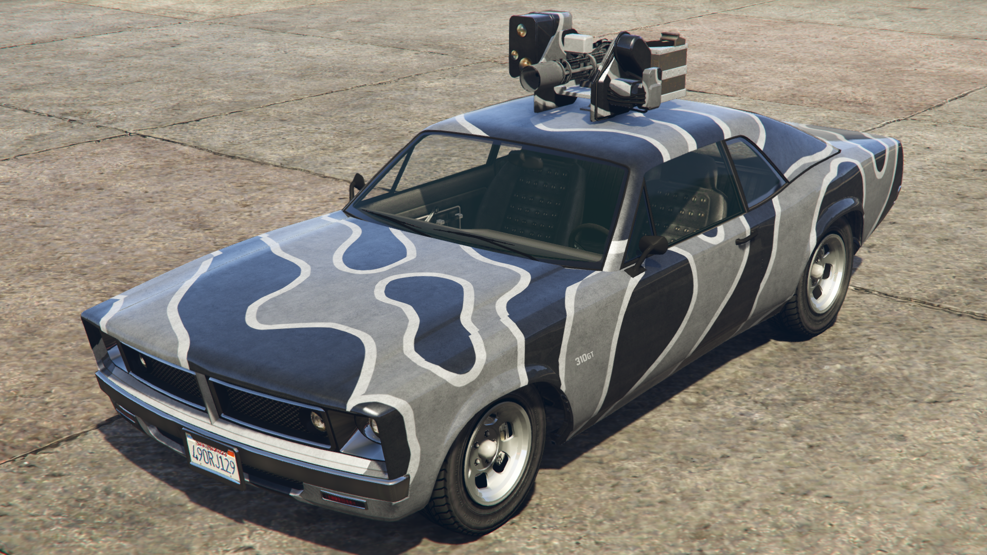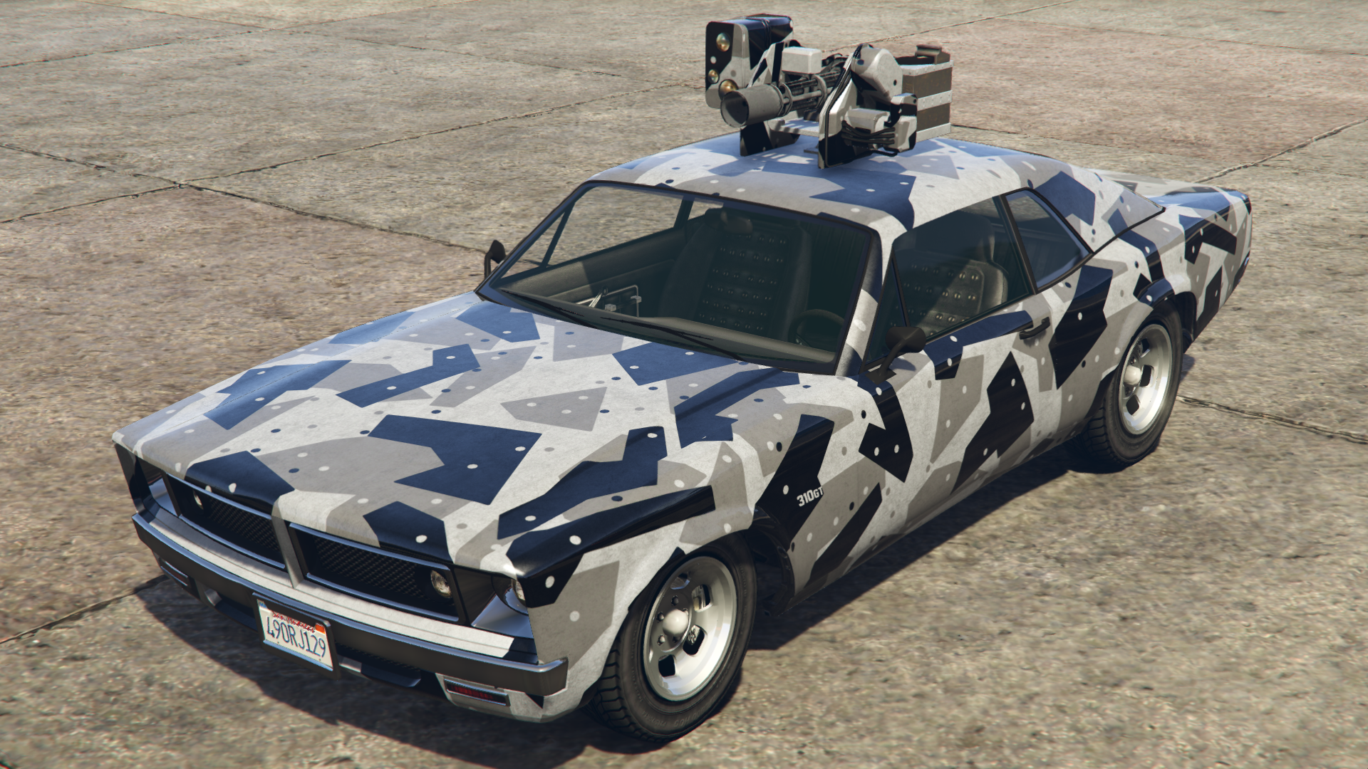 The car appears as an armed variant of the Tampa, featuring a roof-mounted Minigun as standard. The concept can be said to take inspiration from the Roadkill, a weaponized muscle car featured in the Twisted Metal series. Roadkill was a nod to the protagonist vehicle from the 1997 vehicular combat game Interstate 76, which featured a nearly identical weaponized muscle car complete with a roof-mounted machine gun for the player to use during the main quest.