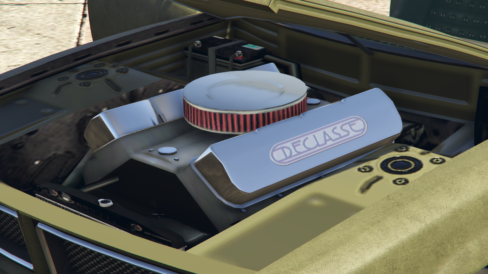 Like the regular Tampa, the vehicle is powered by a 310 cubic inches (5.1 liter) V8, positioned in a front-engine, all wheel drive configuration (1/4 of the engine power to the front wheels and the rest to the rear wheels) and coupled to a 4-speed gearbox. The engine also has a mounted cylindrical air filter by default. It shares the same engine sound as the regular Tampa, being a variation of the one from cars like the Buccaneer, the Blade and the Nightshade, also featuring a supercharged sound effect that is amplified when the "Turbo" upgrade is equipped.