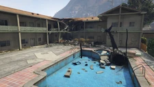 Destroyed Police Maverick | After completing the mission The Paleto Score in GTA V, a destroyed Police Maverick appeared in the Paleto Bay apartment complex, as it has been shot down and crashed directly in the apartment's swimming pool during the mission. | GTA V | |