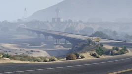 - The bridge appears in the Official Grand Theft Auto V Trailer[6], where the player flies a P-996 LAZER over the bridge, destroying several vehicles including a Rhino Tank positioned on the bridge. This particular event does not occur in-game as the Rhino Tank does not spawn on the bridge at any time.